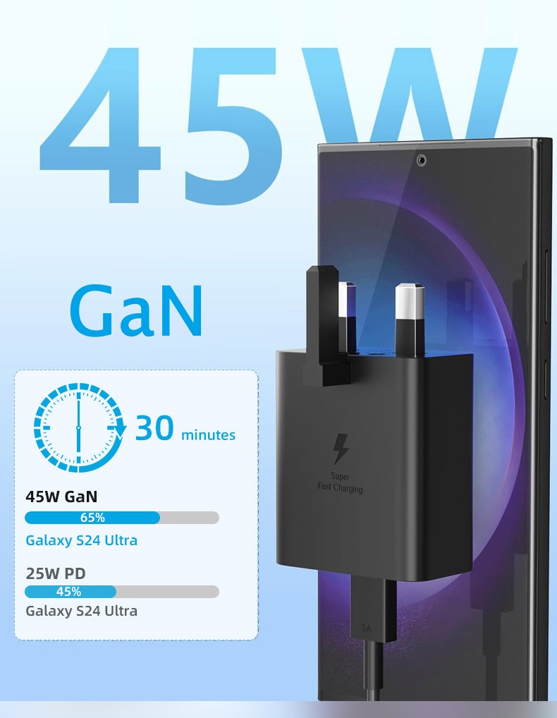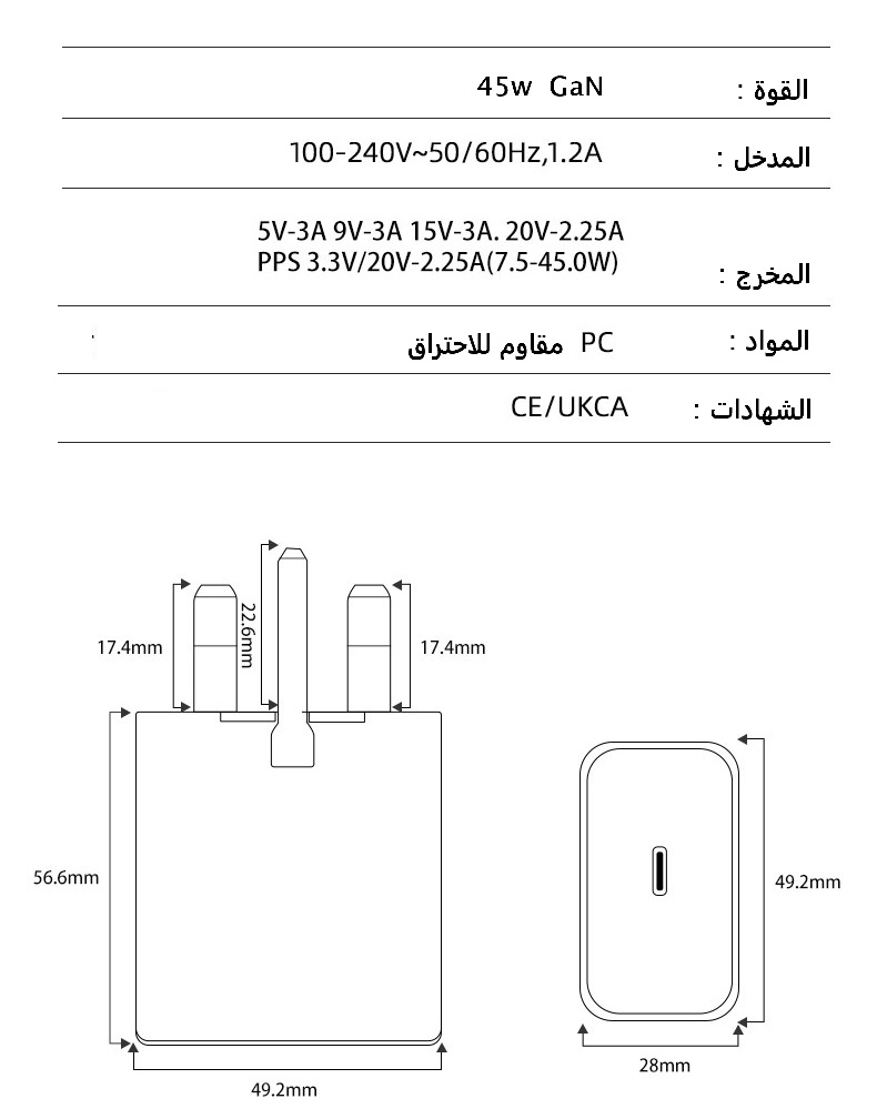 "نقدّم لك شاحن جداري بقدرة 45 واط بمنفذ Type-C يدعم خاصية الشحن السريع لتوفير أداء قوي ومتوافق مع أحدث أجهزة الهواتف والتابلت واللابتوبات الخفيفة. يتميز بخامة PC مقاومة للحريق لضمان سلامة الاستخدام، مع تصميم مدمج مثالي للمنازل والمكاتب والسفر. المنتج متاح بالجملة مع الاستيراد من الصين مع إمكانية إضافة شعارك أو علامتك التجارية عبر خدماتنا OEM وODM."
