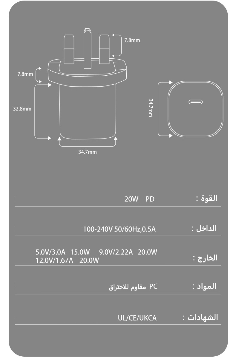 "نقدّم لك شاحن جداري بقدرة 20 واط بمنفذ Type-C يوفّر شحنًا سريعًا وآمنًا للأجهزة الذكية الحديثة. يتميز بتصميم أنيق متوفر باللونين الأبيض والأسود ليناسب جميع الأذواق. مصنوع من خامة PC مقاومة للحريق لزيادة الأمان مع تصميم مدمج عملي مثالي للسفر والاستخدام اليومي. المنتج متاح بالجملة مع الاستيراد من الصين مع خيار إضافة شعارك أو علامتك التجارية من خلال خدماتنا OEM وODM."