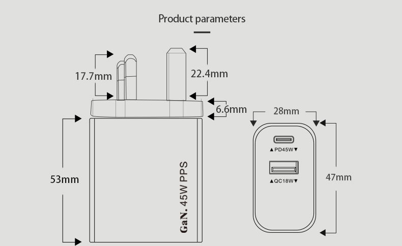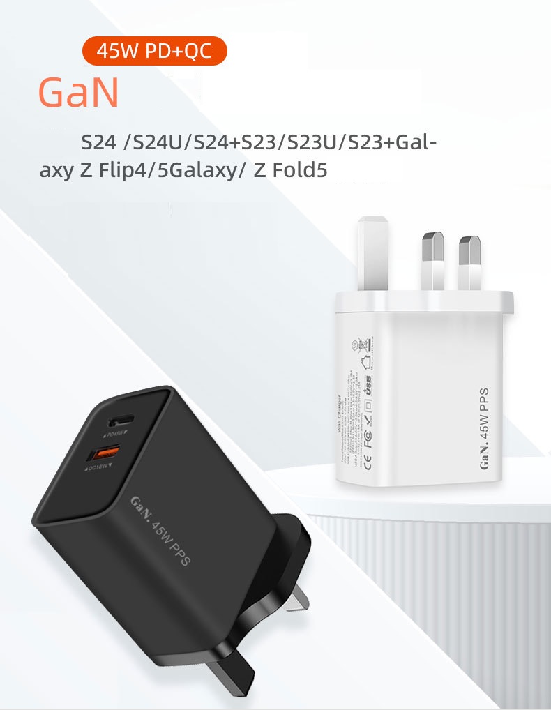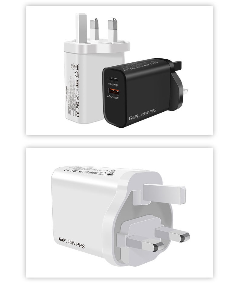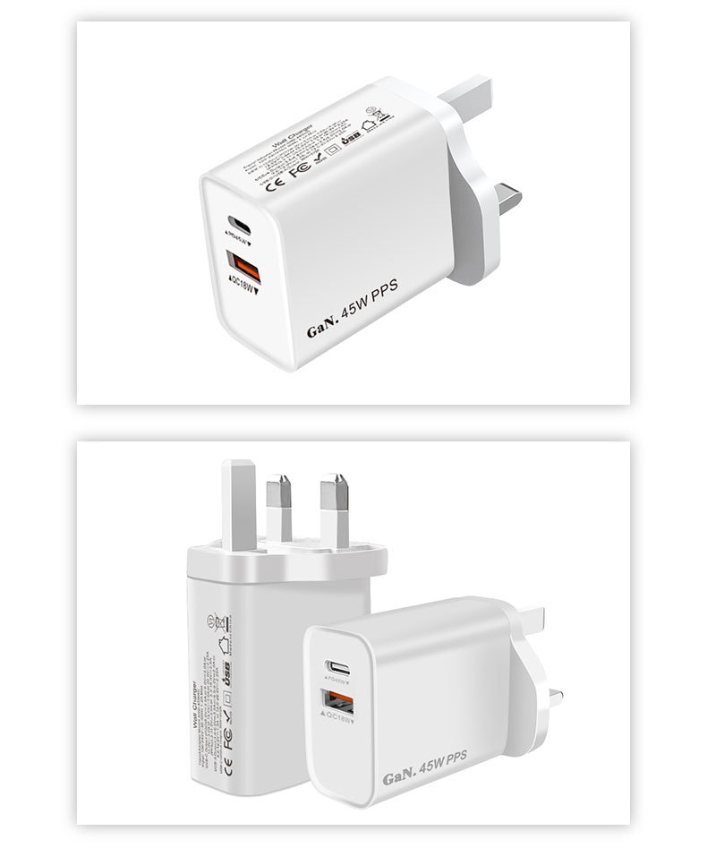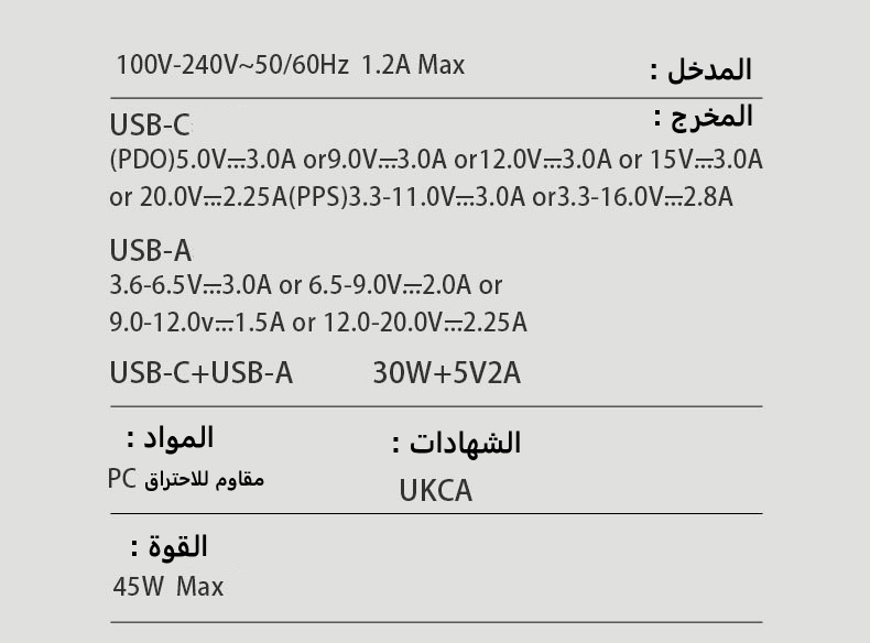 "نقدّم لك شاحن جداري بقدرة 45 واط مزوّد بـ منفذ Type-C ومنفذ USB لتوفير شحن سريع وآمن لأجهزة الآيفون والأندرويد والتابلت. مصنوع من خامة PC مقاومة للحريق لضمان أمان الاستخدام اليومي مع تصميم مدمج عملي مثالي للمنزل والمكتب والسفر. المنتج متاح بالجملة مع الاستيراد من الصين مع إمكانية إضافة شعارك أو علامتك التجارية عبر خدماتنا OEM وODM."