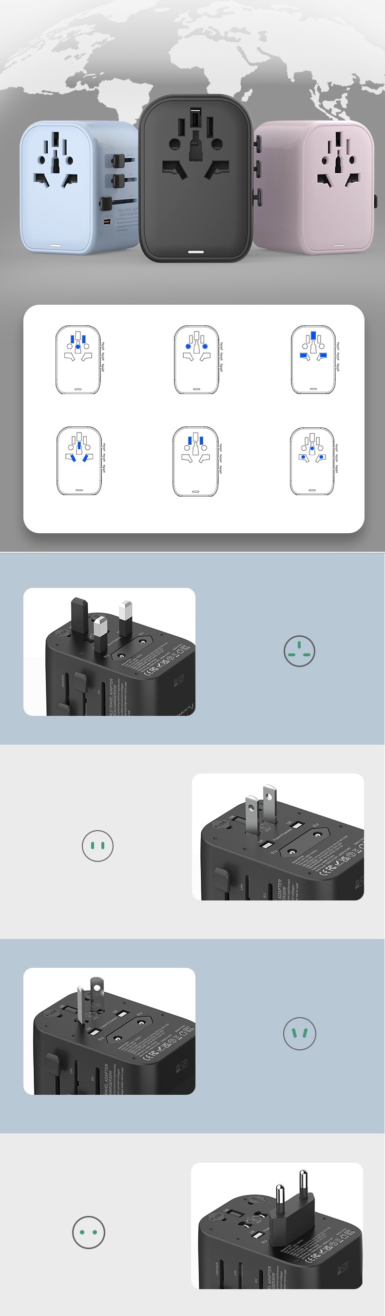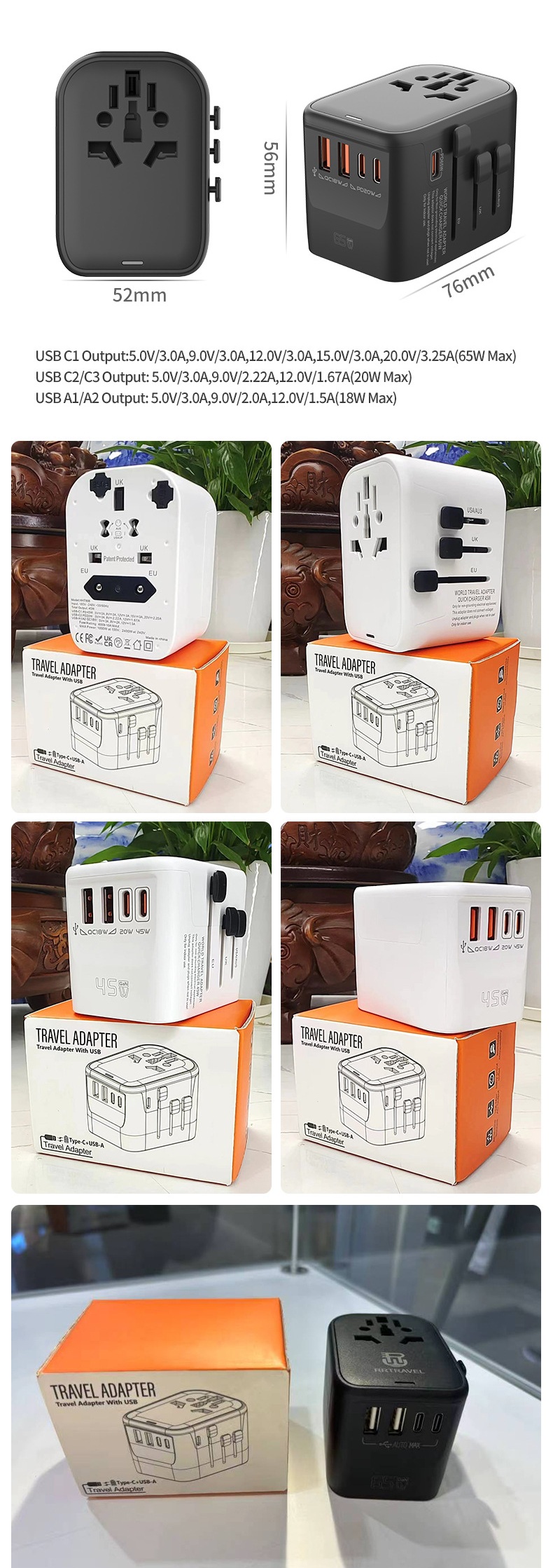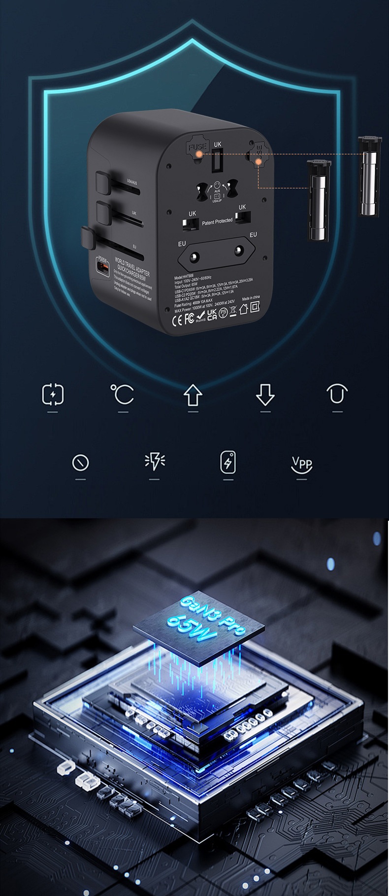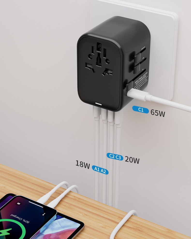 "نقدّم لك فيش سفر بقوة 65 واط متعدد المداخل مزوّد بـ 3 منافذ Type-C ومنفذين USB لشحن خمسة أجهزة في وقت واحد بكفاءة عالية. يتميز بخامة PC مقاومة للحريق لضمان أعلى مستويات الأمان، مع وزن عملي 170 غرام وتصميم مدمج مثالي للسفر والاستخدام اليومي. المنتج متاح بالجملة مع الاستيراد من الصين مع إمكانية طباعة الشعار أو العلامة التجارية عبر خدماتنا OEM وODM."