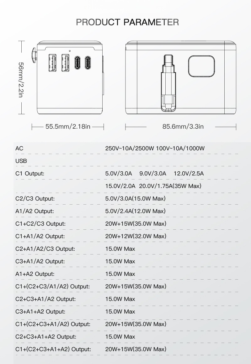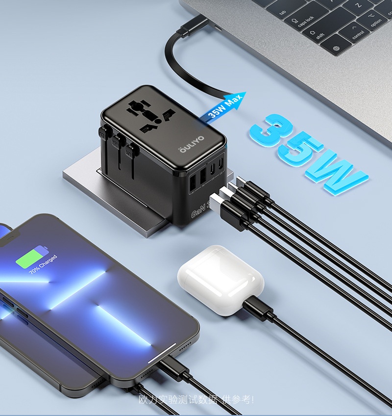 "اكتشف فيش السفر متعدد المداخل بقوة 35 واط المصمم لتوفير شحن آمن وسريع. يأتي مع منفذين Type-C ومنفذين USB إضافةً إلى سلك تايب سي عملي ليغطي جميع احتياجاتك من الشحن. تم تصنيعه من خامة PC مقاومة للحريق لضمان أعلى درجات الأمان أثناء الاستخدام في المنزل أو أثناء السفر. هذا المنتج متاح بالجملة مع الاستيراد من الصين مع إمكانية تخصيص العلامة التجارية أو الشعار الخاص بك من خلال خدماتنا OEM وODM."